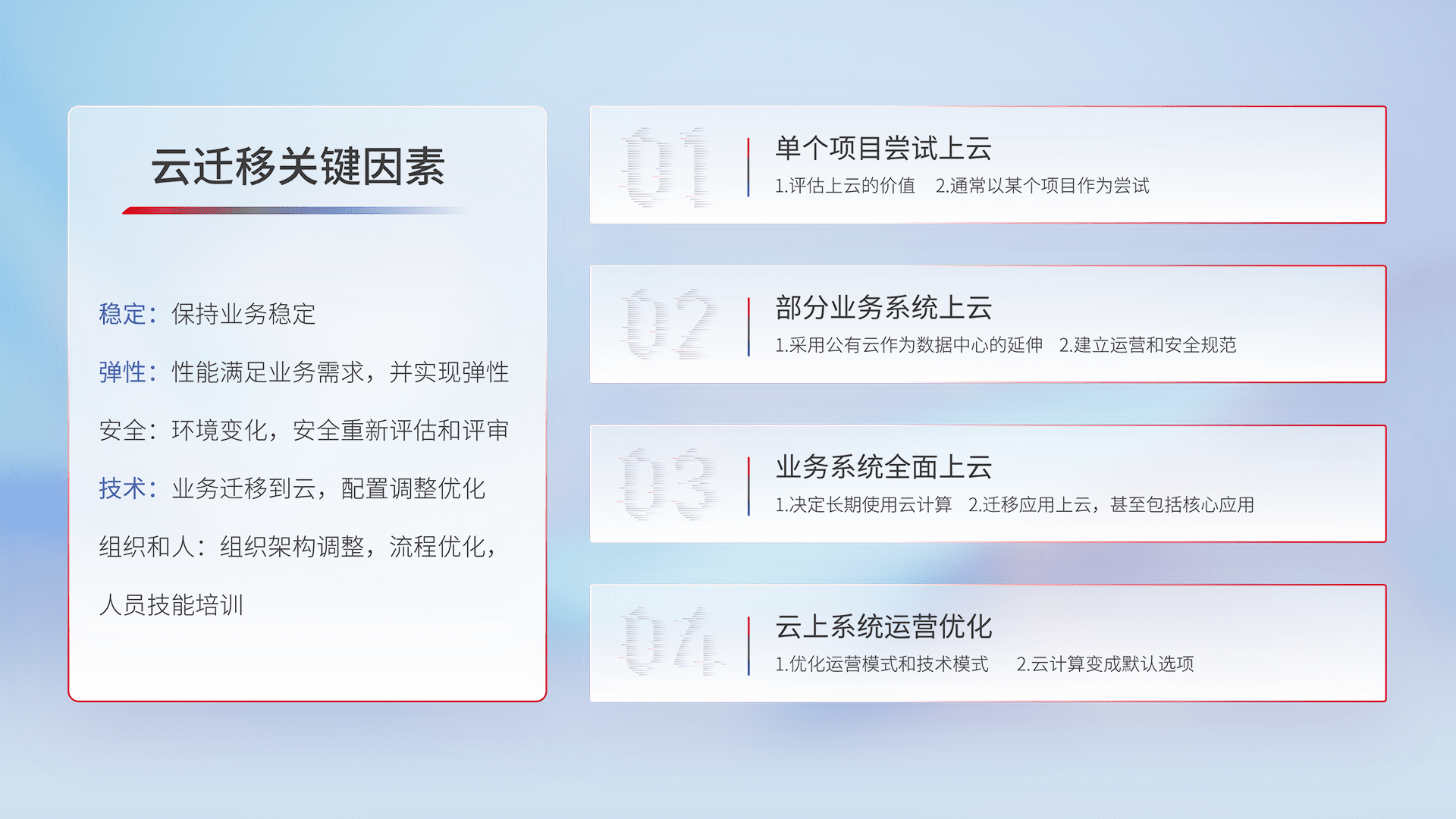 结合实际业务,,,,从规划设计、、、云平台选型、、、、云原生改造、、、数据迁移、、、、集成交付,,迁移全过程为客户识别最佳上云路径,,,做好风险识别管理,,,,设计网络架构、、、、身份权限、、、安全审计合规、、、操作审计、、日志审计、、、监控告警策略、、、、多站点容灾设计等,,,,对云上基础设施进行整体规划,,提升IT治理水平,,,,以满足弹性、、、、高可用、、、、高性能的需求。。。