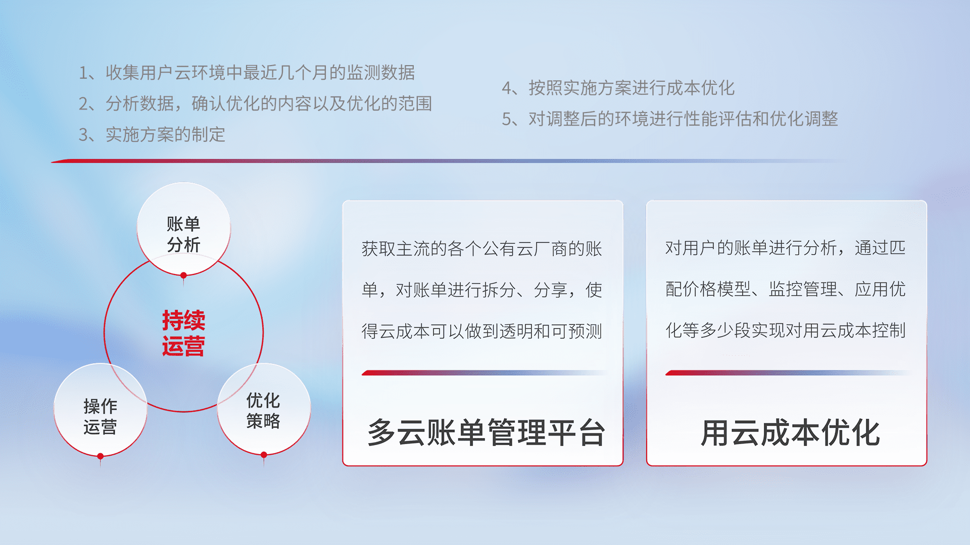 通过多云纳管,,,,以统一的资源数据模型把客户的云资源进行抽象和封装,,,,进而实现对多云资源的统一操作,,保障云资源管理的可靠性、、、、稳定性与可用性。。。量身定制化运维内容,,,,配置、、、、开发运维、、、、补丁管理、、、、备份、、、监控、、、认证和访问管理、、审计和日常巡检等,,,,保障在用云过程中的可靠度,,稳定度以及高可用率。。